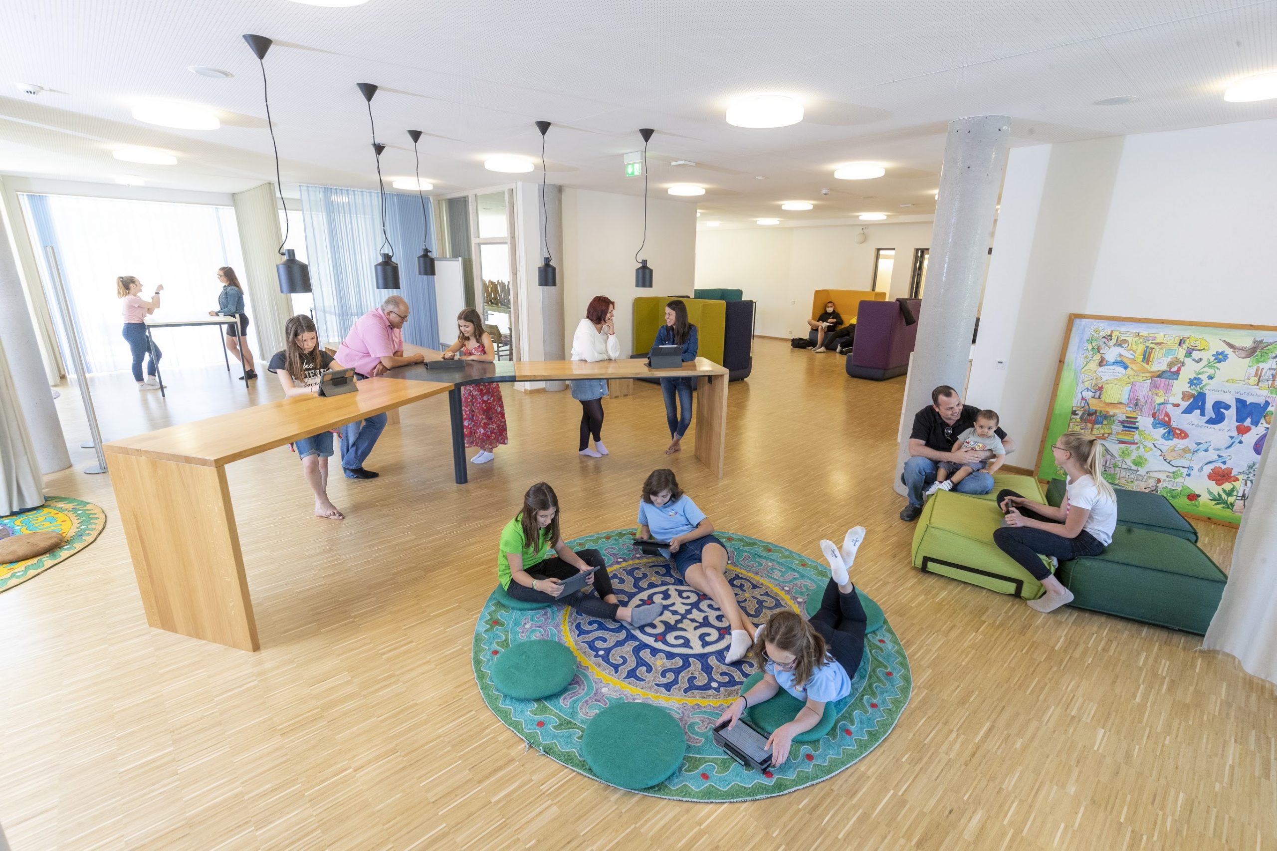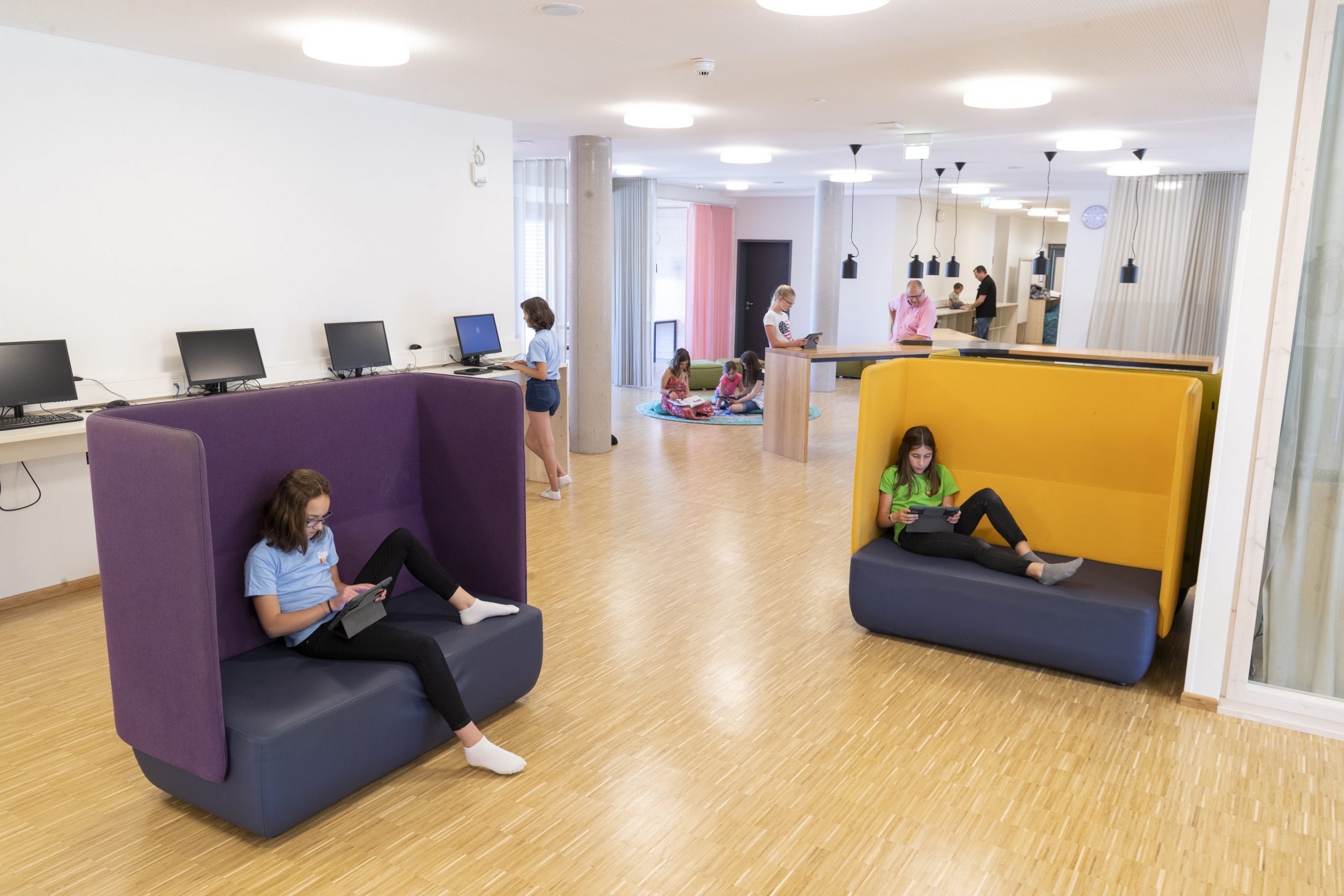 Wir haben gewohnte Begriffe umbenannt: Die Schulhäuser heißen Lernhäuser und sind modern und einladend eingerichtet. Jedes Lernhaus hat ein Lernatelier zum Stillarbeiten und einen Marktplatz für den Austausch und gemütliche Ruhebereiche. Die Kinder dürfen sich in unserem Lerndorf frei bewegen und lernen da, wo sie möchten.