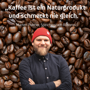 Wieder in der Speicherstadt, diesmal in der Speicherstadt-Rösterei. 300 Tonnen Kaffee werden hier, mitten im Café, geröstet und eine Etage drüber verpackt und etikettiert, um dann zum Teil wieder unten im Café und Shop über den Tresen zu gehen. „Von den Zahlen sind wir keine kleine Rösterei mehr, von der Herangehensweise und der Leidenschaft schon“, sagt Marten Pulmer aus dem Außendienst. „Wir suchen die Bohnen erst nach Qualität, den Projekten dahinter und der Fairness aus, dann kriegen wir den Preis.“